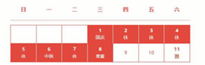 10月1日(星期三)至10月8日(星期三)放假调休,共8天。