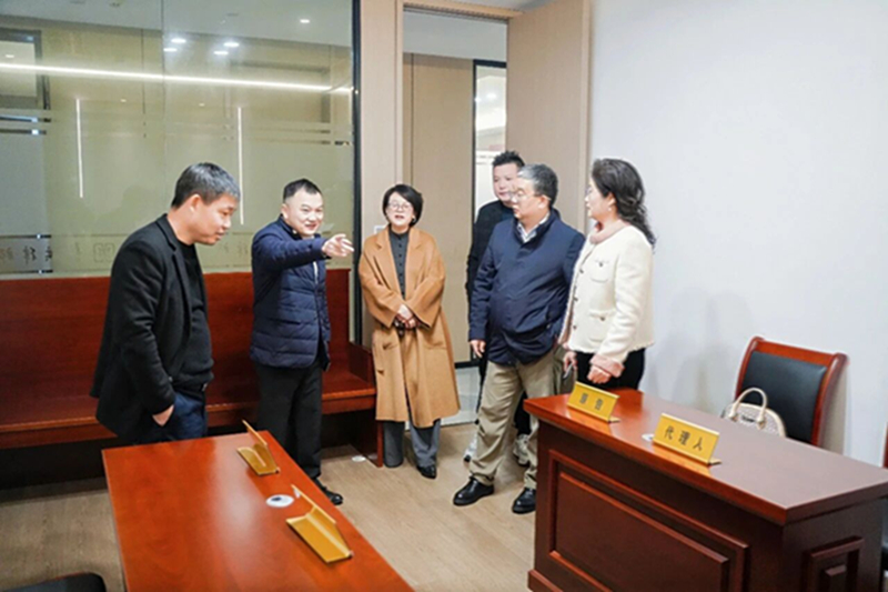 上午10:45时,走访团一行抵达第二站——常务副会长盛杰创办的浙江聚祺律师事务所。盛杰主任热情接待了走访团,陪同参观了律所办公场所。整洁有序的办公环境、放满各类荣誉奖牌的荣誉柜、庄严的模拟法庭,充分展现了律所的专业实力与品牌形象,给走访团成员留下了深刻印象。