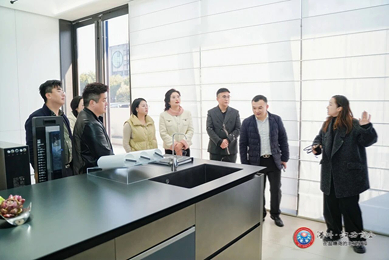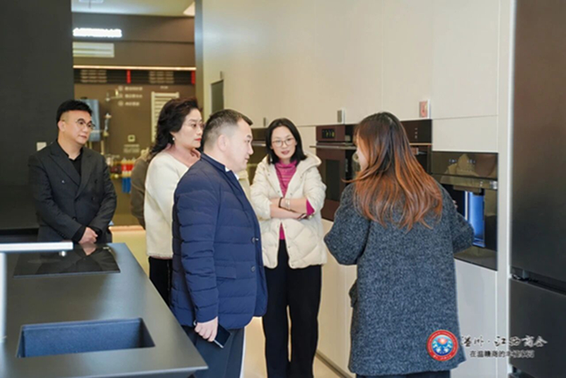下午2时许,走访团一行抵达本次走访的最后一站——副会长兰成华执掌的浙江新饰界企业控股有限公司。走访团首先走进公司代理的美的高端电器品牌COLMO温州城市体验中心。这座AI智能体验馆,凭借前沿的空间设计与先进的智能家电矩阵,直观勾勒出未来智慧生活的全新图景。大家深入了解到,COLMO以“AI科技家电”为核心的全屋智能解决方案,正将科技深度融入生活点滴:从空气调节、净水系统,到洗护方案、智能烹饪,全方位构建起便捷、舒适、健康的人居场景,让曾经抽象的科技概念,转化为触手可及的美好生活体验。