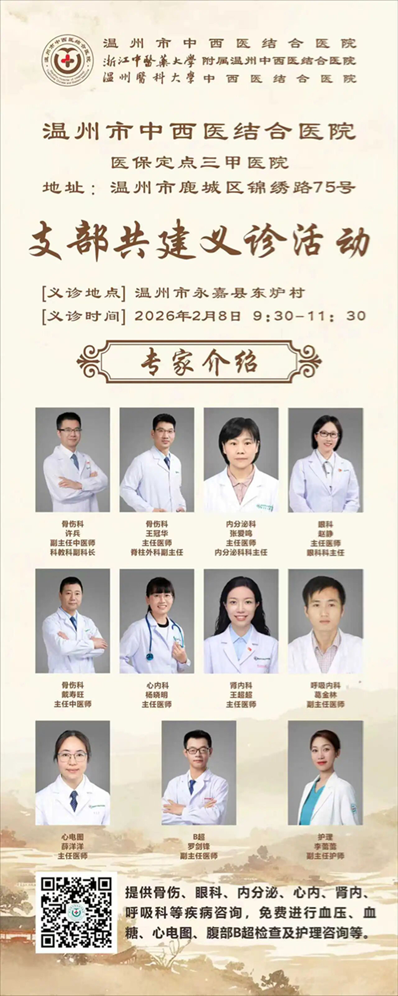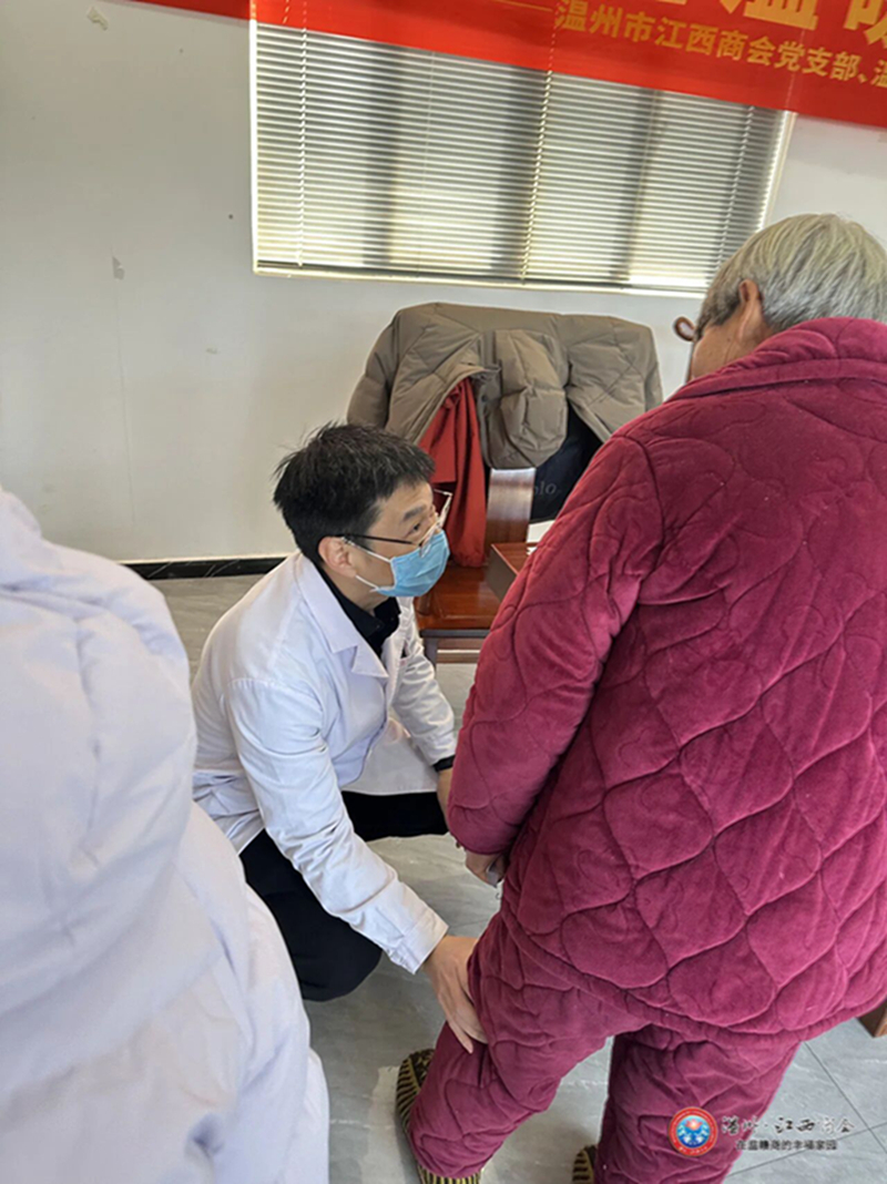 新春将至,暖意融融。为深入践行党建引领民生服务的核心理念,积极响应市工商联2025年深化“同心共富”、温商助力“相对薄弱村”帮扶的工作部署,持续深化2022年启动的“百会千企兴百村”行动成效,切实破解乡村群众就医不便的民生难题,2026年2月8日,温州市江西商会党支部携手温州市中西医结合医院骨伤科党支部、永嘉县鹤盛镇东炉村党支部,在东炉村办公楼联合开展“情系东炉送温暖·医商共建护健康”党建共建公益服务活动。活动以“健康义诊+生活便民+节日慰问”的多元服务模式,将优质医疗资源与暖心关怀送到村民家门口,凝聚起医、商、村共建合力,绘就了协同助力乡村振兴的暖心画卷。温州市江西商会执行会长蔡泽鑫,党支部书记、常务副会长邹华清,特别顾问聂文勇,本月轮值常务副会长熊年华,常务副会长李辉玗、陈斌良,专职秘书长徐珍珍及会员企业家党员志愿者共19人,以及温州市中西医结合医院科教科副科长许兵副主任中医师,骨伤科党支部副书记、脊柱外科副主任王冠华主任医师等骨干专家、护士们共18人参加了本次活动。