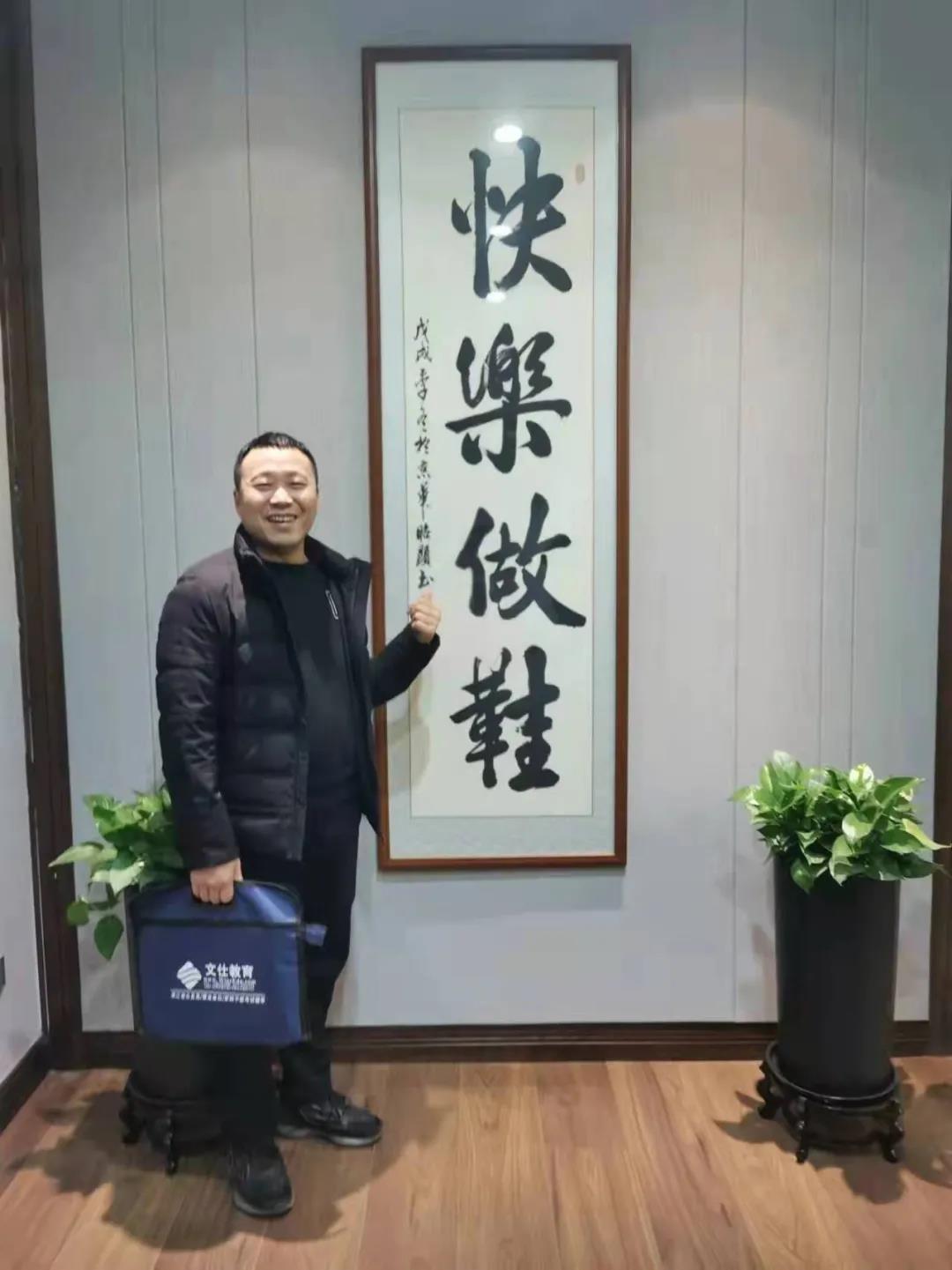 走进副会长杨华办公室门口,就看见挂着一幅大气磅礴的书法作品,上书“快乐做鞋“四个大字,再进入办公室,在办公桌背面还挂着一幅书写着”品质行天下“的书法作品,这两幅书法作品的内容吸引了走访团一行的注意。